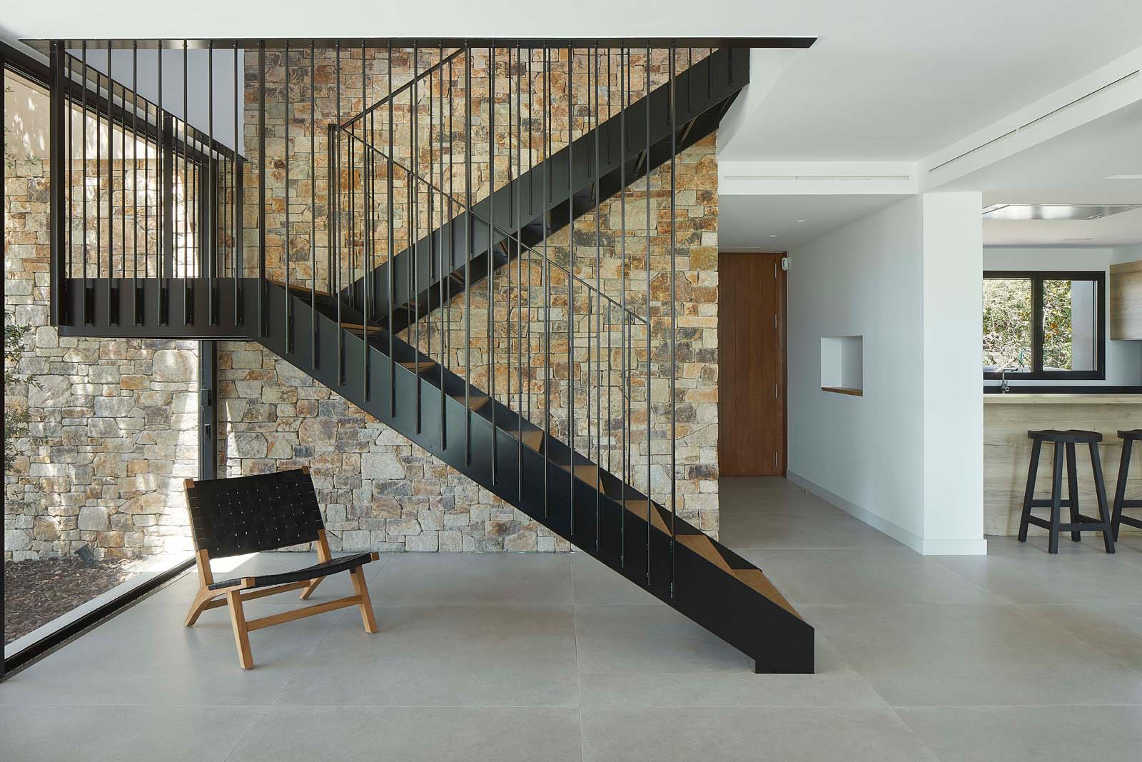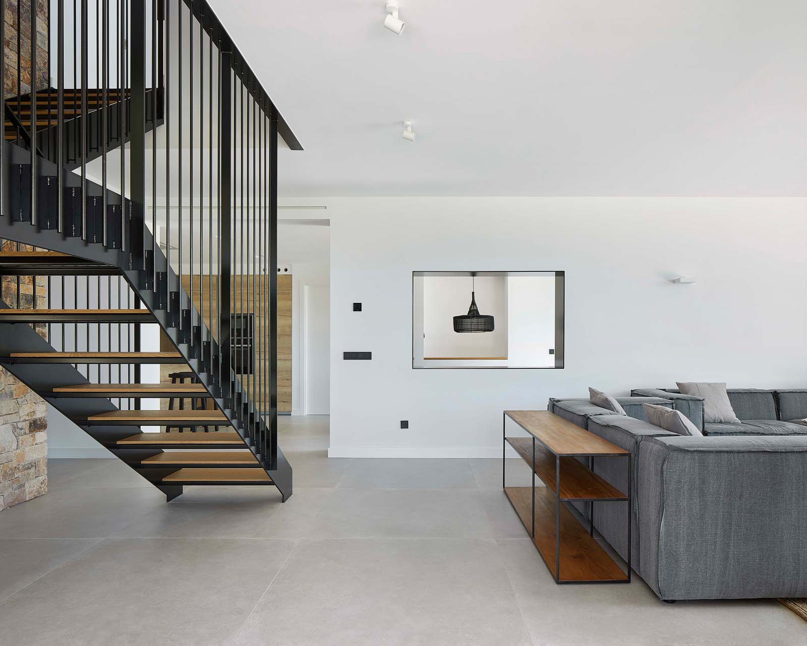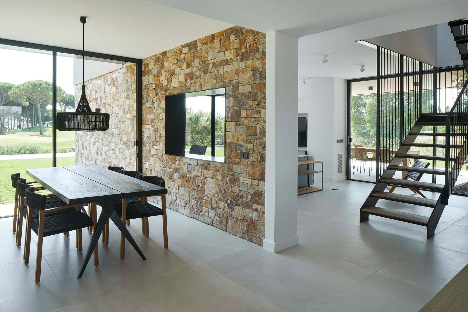 It is not only the windows that have created this continuum with the nature surrounding the villa: among the design and architectural tricks used by the Jané & Font firm, we can immediately note the use of dry stone to clad the exterior of the ground floor – and some strategic walls in the living area – designed to project the earthy shades and colors inside the house. The decision to use the same floor covering for the interior and porch area also played a key role in ensuring continuity between the interior and exterior: here, too, a custom stone-effect porcelain stoneware collection by Ragno Ceramiche in size 120×120 cm, was chosen to evoke the natural hues in the greige tones of stone.
