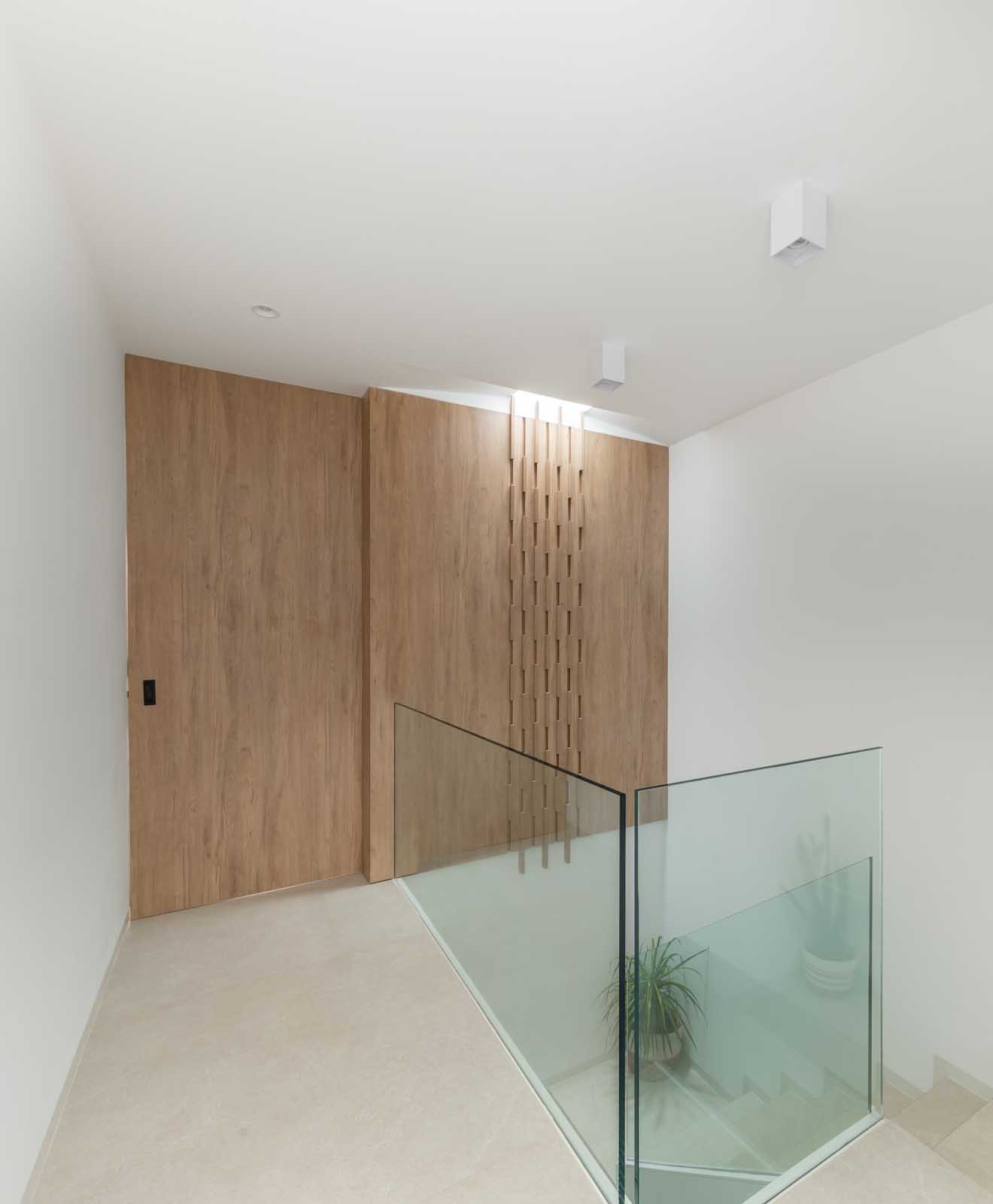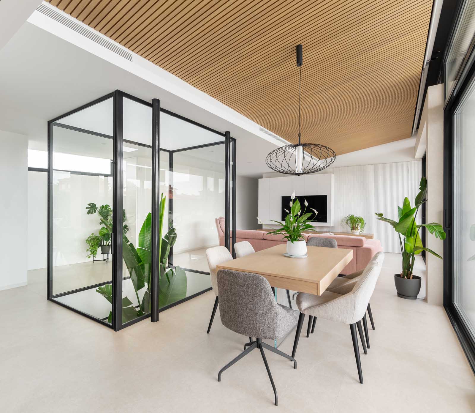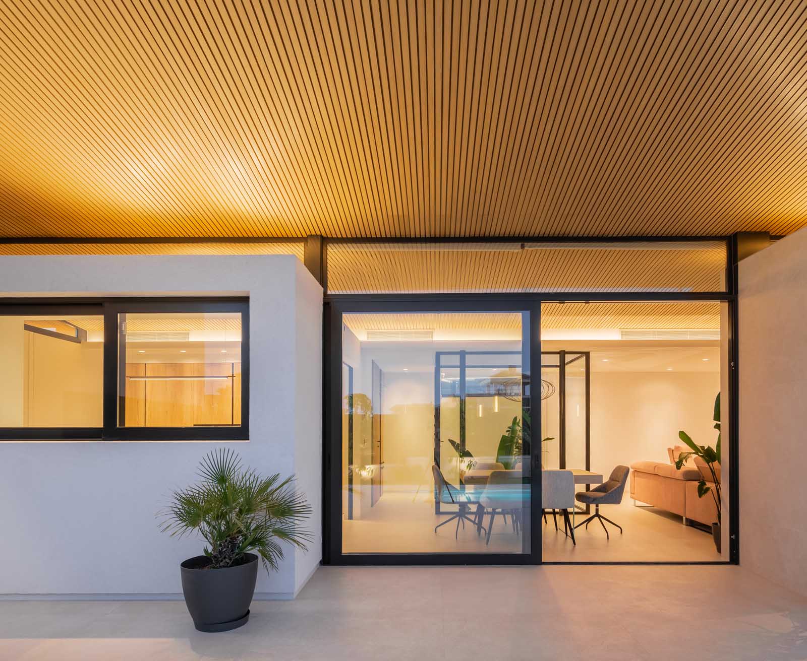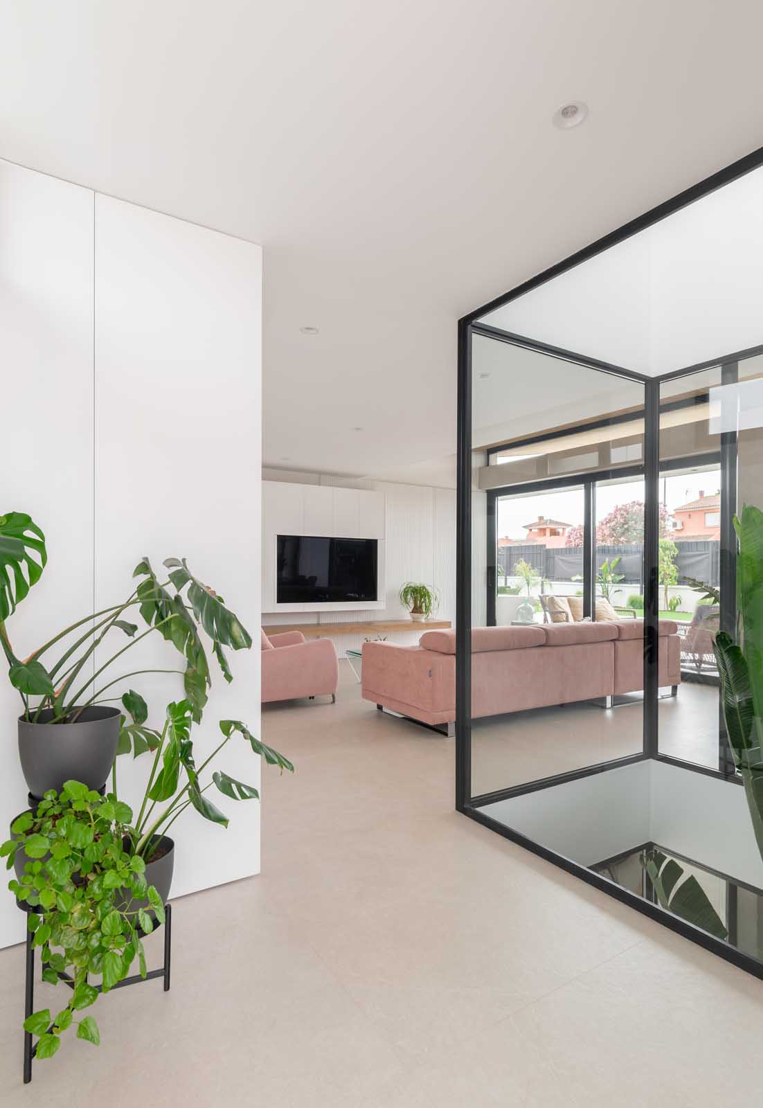 A questo elementi si aggiunge la grande finestra che unifica e protegge le aperture dell’ufficio e della camera da letto. E infine, le tende a scomparsa con persiane mobili sono incorporate in queste stesse aperture, dando all’abitante la possibilità di controllare attivamente l’incidenza della luce solare. Insieme alla protezione solare, la ventilazione è l’altro elemento chiave per il comfort termico in casa. In questo caso, un piccolo cortile accanto all’ingresso principale funge da camino solare per favorire naturalmente la circolazione dell’aria sia nel seminterrato che al piano terra. Questo spazio verde permette anche ai proprietari di coltivare la loro passione per il giardinaggio.