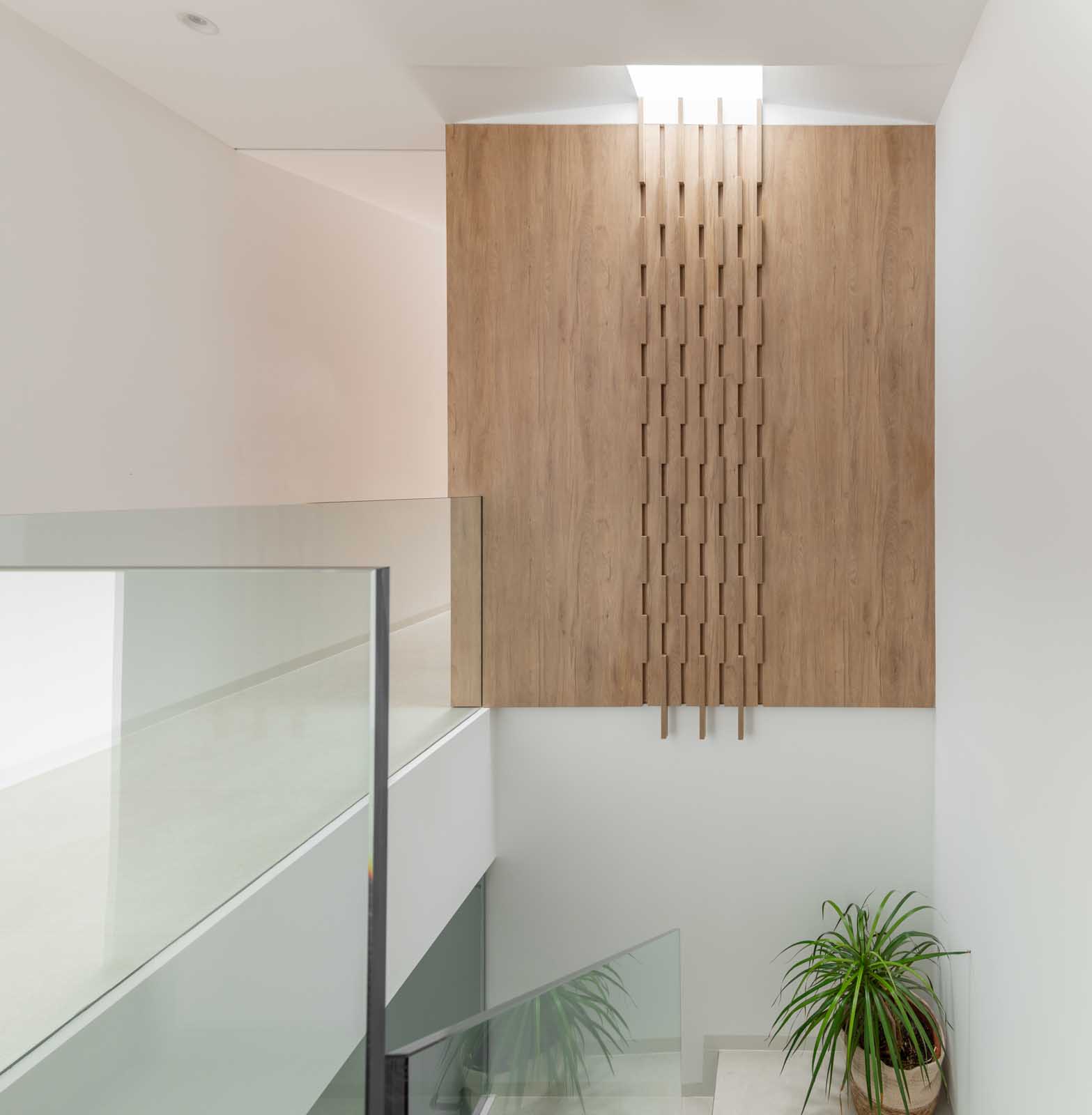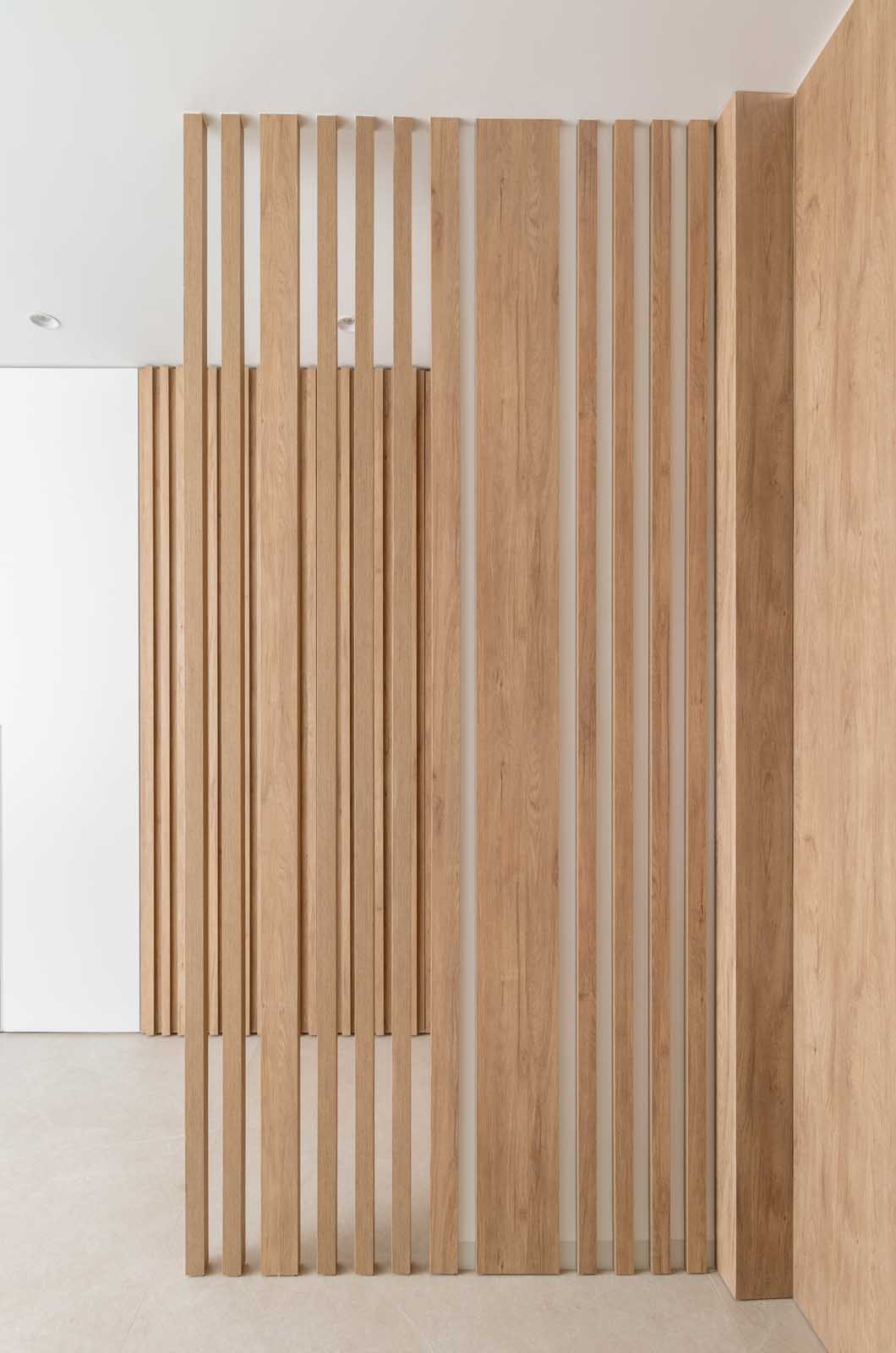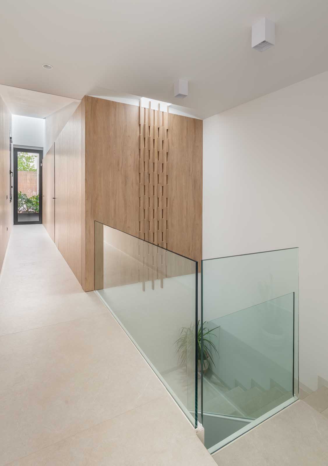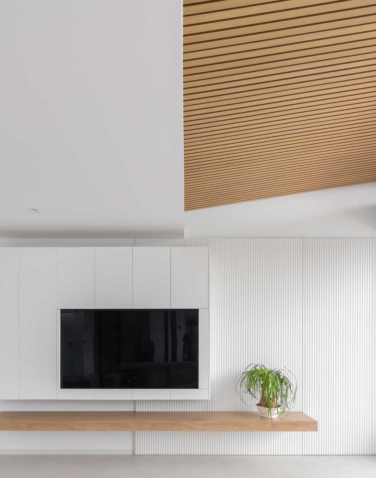A questo elementi si aggiunge la grande finestra che unifica e protegge le aperture dell’ufficio e della camera da letto. E infine, le tende a scomparsa con persiane mobili sono incorporate in queste stesse aperture, dando all’abitante la possibilità di controllare attivamente l’incidenza della luce solare. Insieme alla protezione solare, la ventilazione è l’altro elemento chiave per il comfort termico in casa. In questo caso, un piccolo cortile accanto all’ingresso principale funge da camino solare per favorire naturalmente la circolazione dell’aria sia nel seminterrato che al piano terra. Questo spazio verde permette anche ai proprietari di coltivare la loro passione per il giardinaggio.