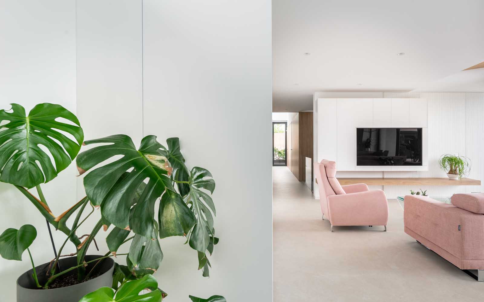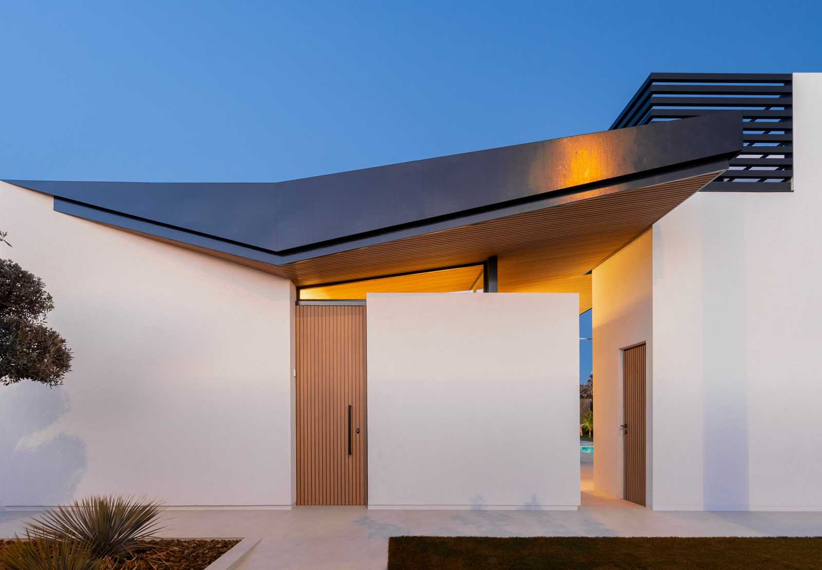 La facciata a sud della casa è caratterizzata da elementi sporgenti e rientranti che ottimizzano l’interazione con il sole. Una grande terrazza a sbalzo protegge l’area living esterna, separata dalla facciata da una vetrata che crea una continuità visiva tra interno ed esterno.