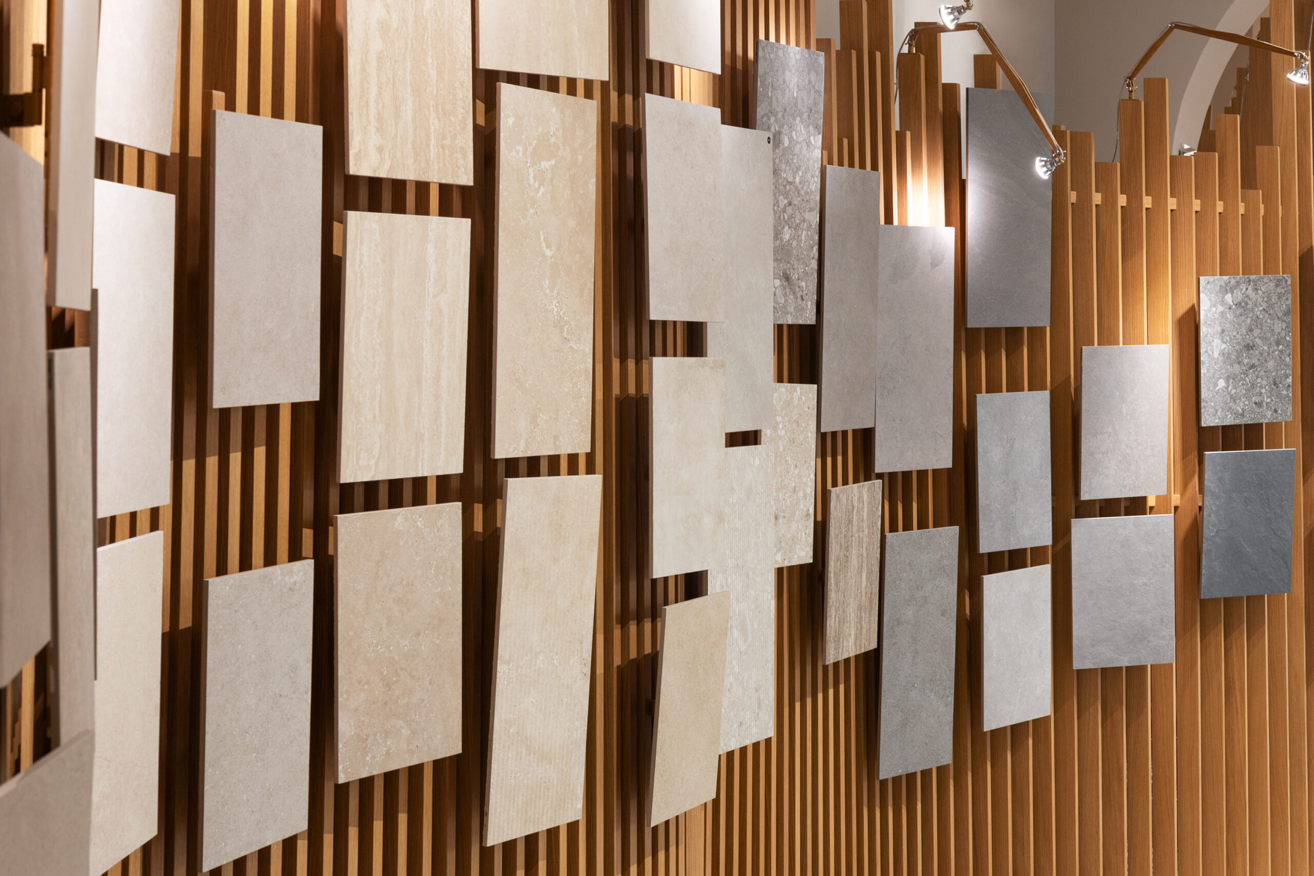 The ceramic surfaces interpret colors and textures with a warm, contemporary aesthetic, shaping rooms rich in nuances.