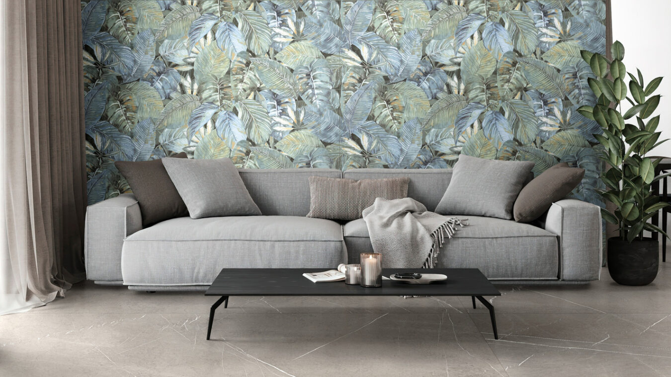 A large-size wallpaper-effect wall covering for creating striking backdrops in different decorative styles, to be matched with solid color plain tiles, for living spaces that tell your story.