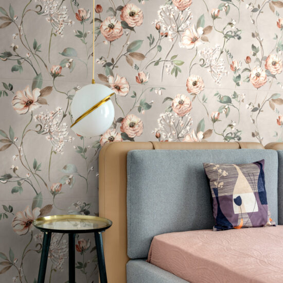 A semi-matt, soft-touch surface enhanced with crystalline grits which add an exquisite finishing touch to the range of multicolor, tropical and geometrical floral decorations. Five all-over patterns explore the world of hyper-decoration and provide the perfect backdrop for bathrooms, living rooms, bedrooms and commercial locations, combined with four plain tile colors – Bianco, Beige, Verde and Blu – and the Shanghai 3D Structure in Bianco. Versatile coverings, easily customised both in boiserie panels supporting the decors and across whole walls for a total look interior design effect.
