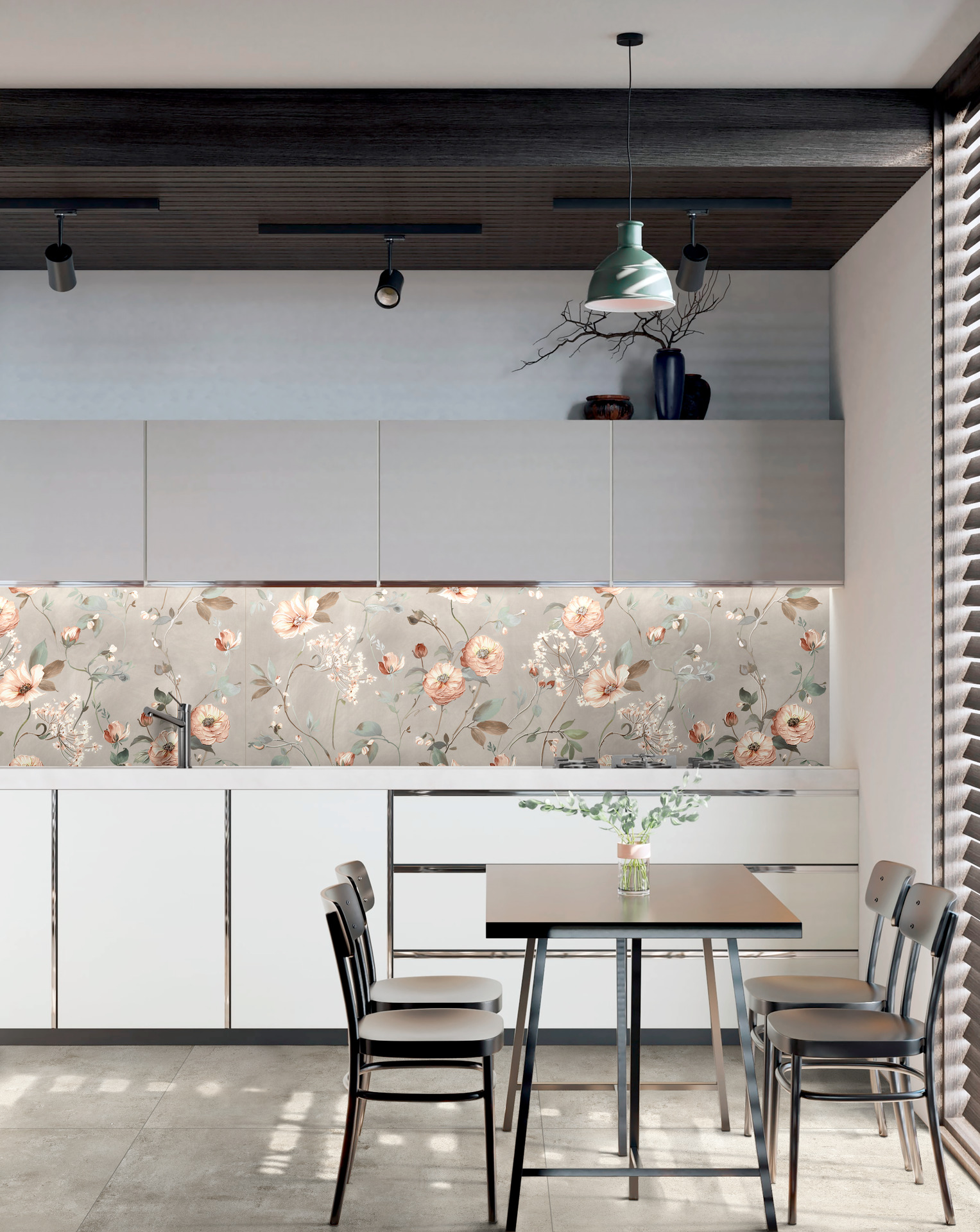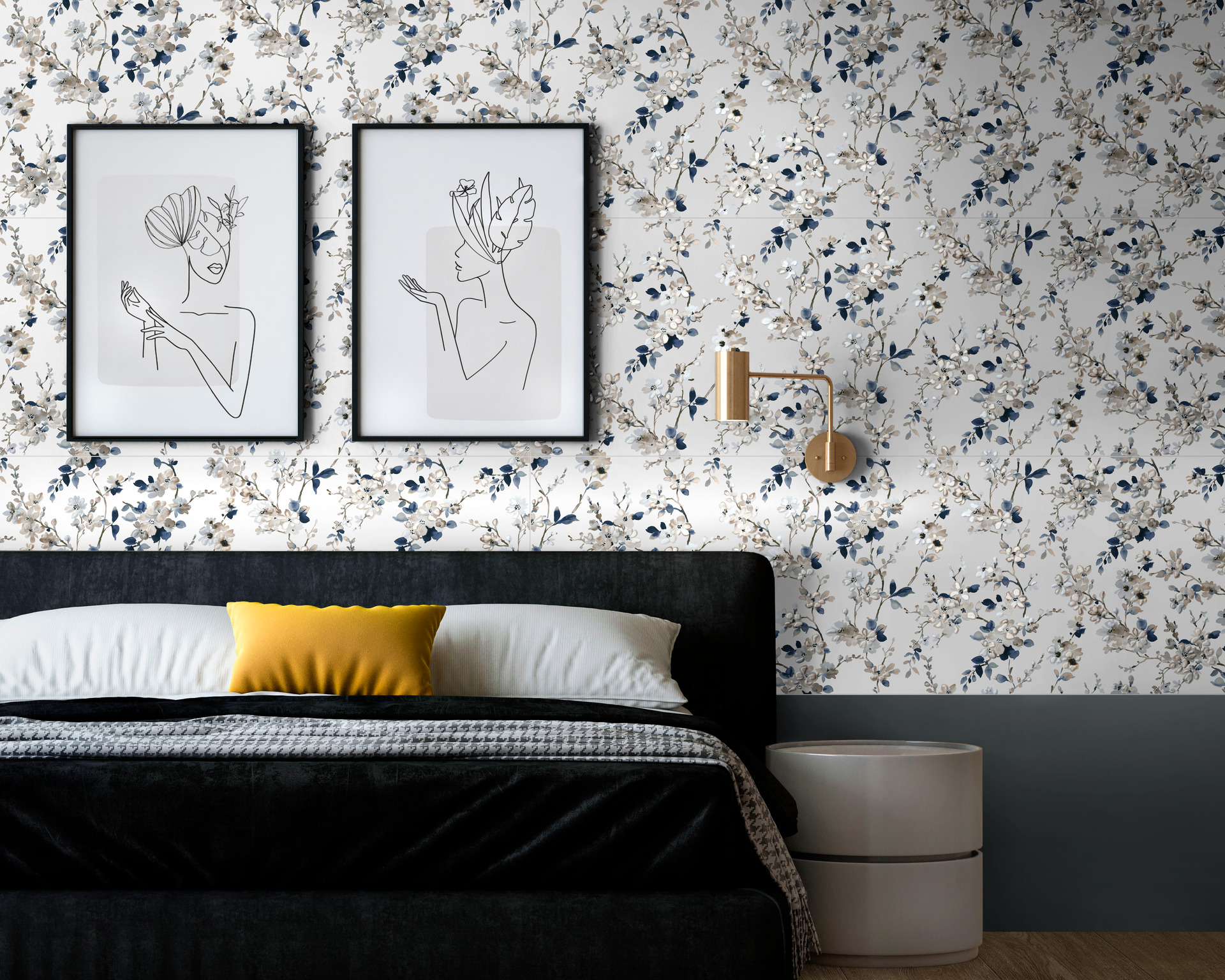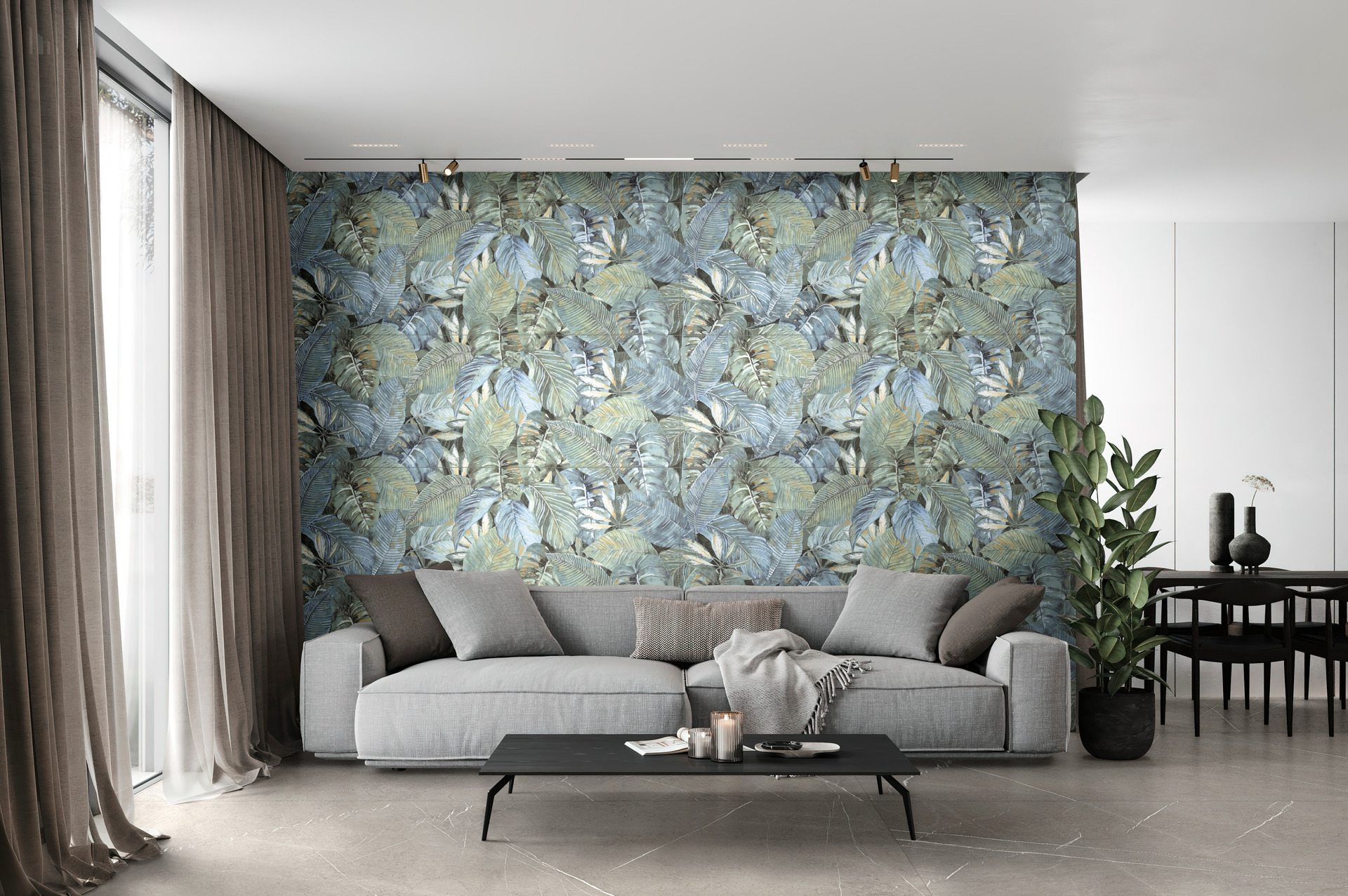 A large-size wallpaper-effect wall covering for creating striking backdrops in different decorative styles, to be matched with solid color plain tiles, for living spaces that tell your story.
