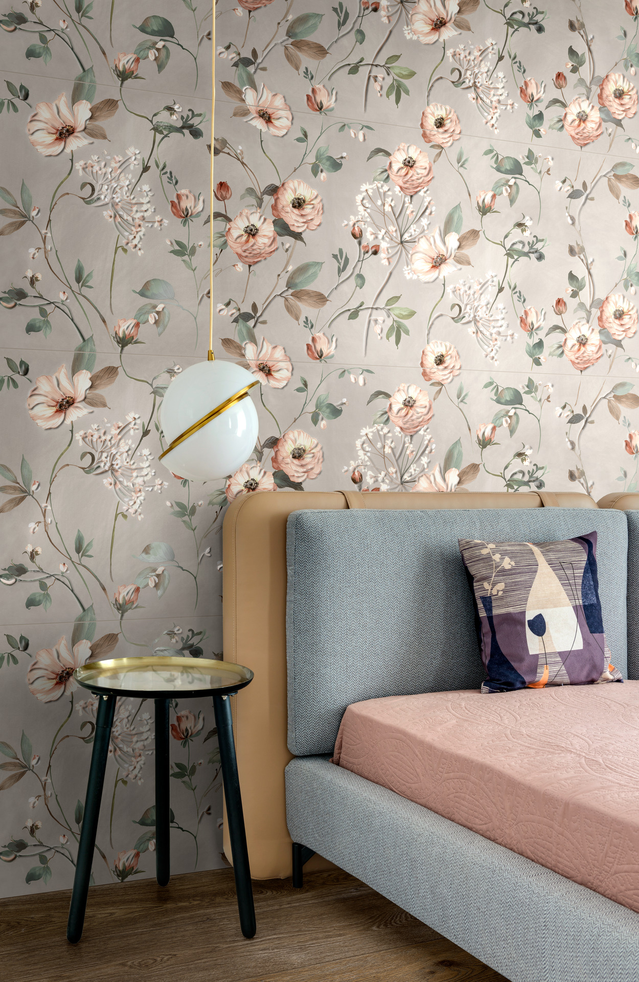 A semi-matt, soft-touch surface enhanced with crystalline grits which add an exquisite finishing touch to the range of multicolor, tropical and geometrical floral decorations. Five all-over patterns explore the world of hyper-decoration and provide the perfect backdrop for bathrooms, living rooms, bedrooms and commercial locations, combined with four plain tile colors – Bianco, Beige, Verde and Blu – and the Shanghai 3D Structure in Bianco. Versatile coverings, easily customised both in boiserie panels supporting the decors and across whole walls for a total look interior design effect.