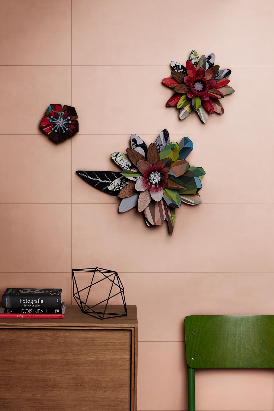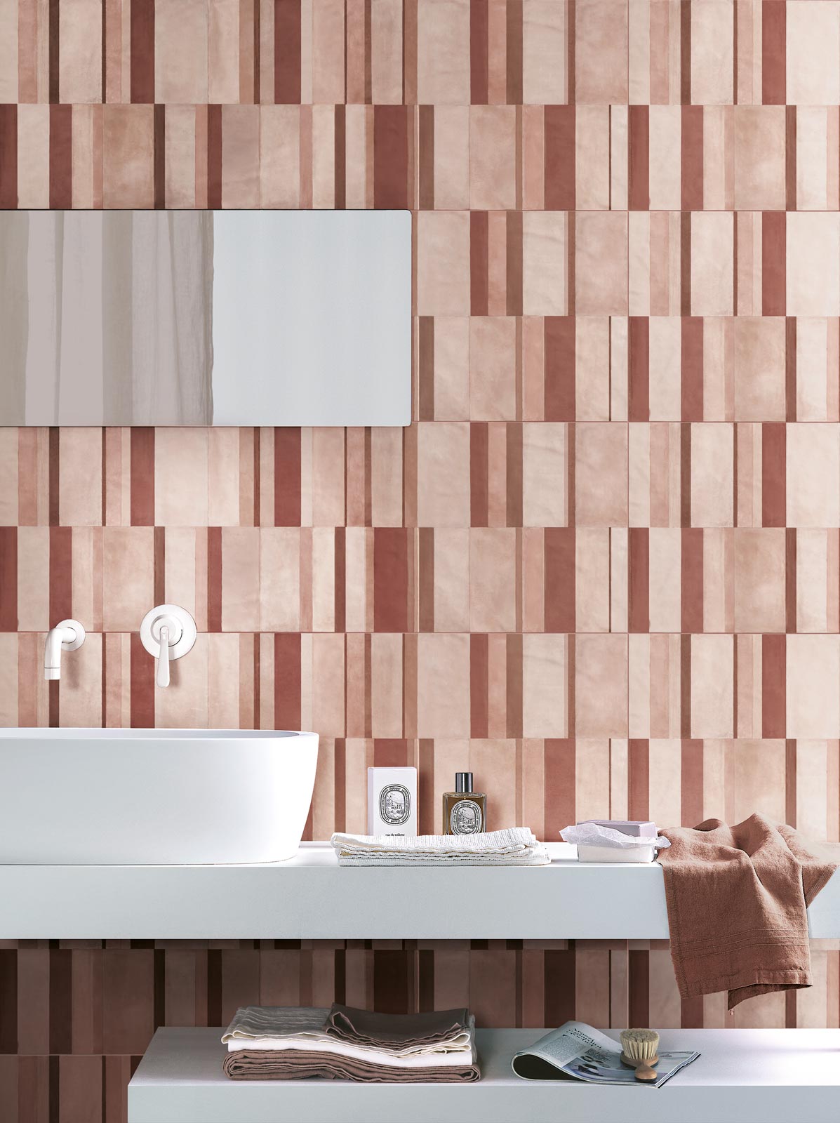 Beginning with the base element, the collection also includes a series of surface texture variations that play around with light and shade and give walls depth, texture and thickness, both visual and tactile. The Bee and Wall structures, which can be laid both horizontally or vertically, create, respectively, a honeycomb pattern formed of hexagons on adjoining tiles and a weave that recalls and offers a modern twist on old walls made of stone or small bricks.