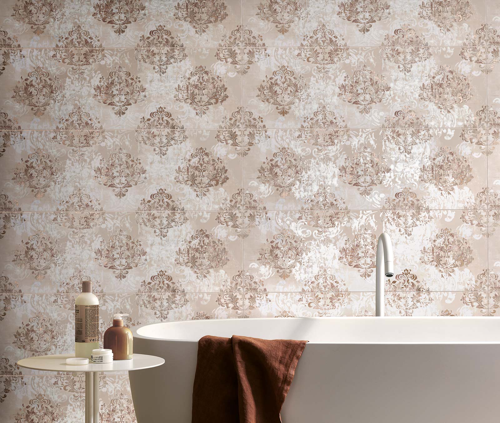 There are also decors and mosaics which have two distinct sources of inspiration: one more rigorous connected with geometry and colour contrasts, and the other softer and more evocative, based on botanical and textile motifs. The Venezia and Tropicana decors fall into this second category and are produced using the third firing technique while the digitally-produced Bricks plays around with clean lines and forms. The two mosaics, Classico and Forme, follow suit and come in all six of the base tile colour options.