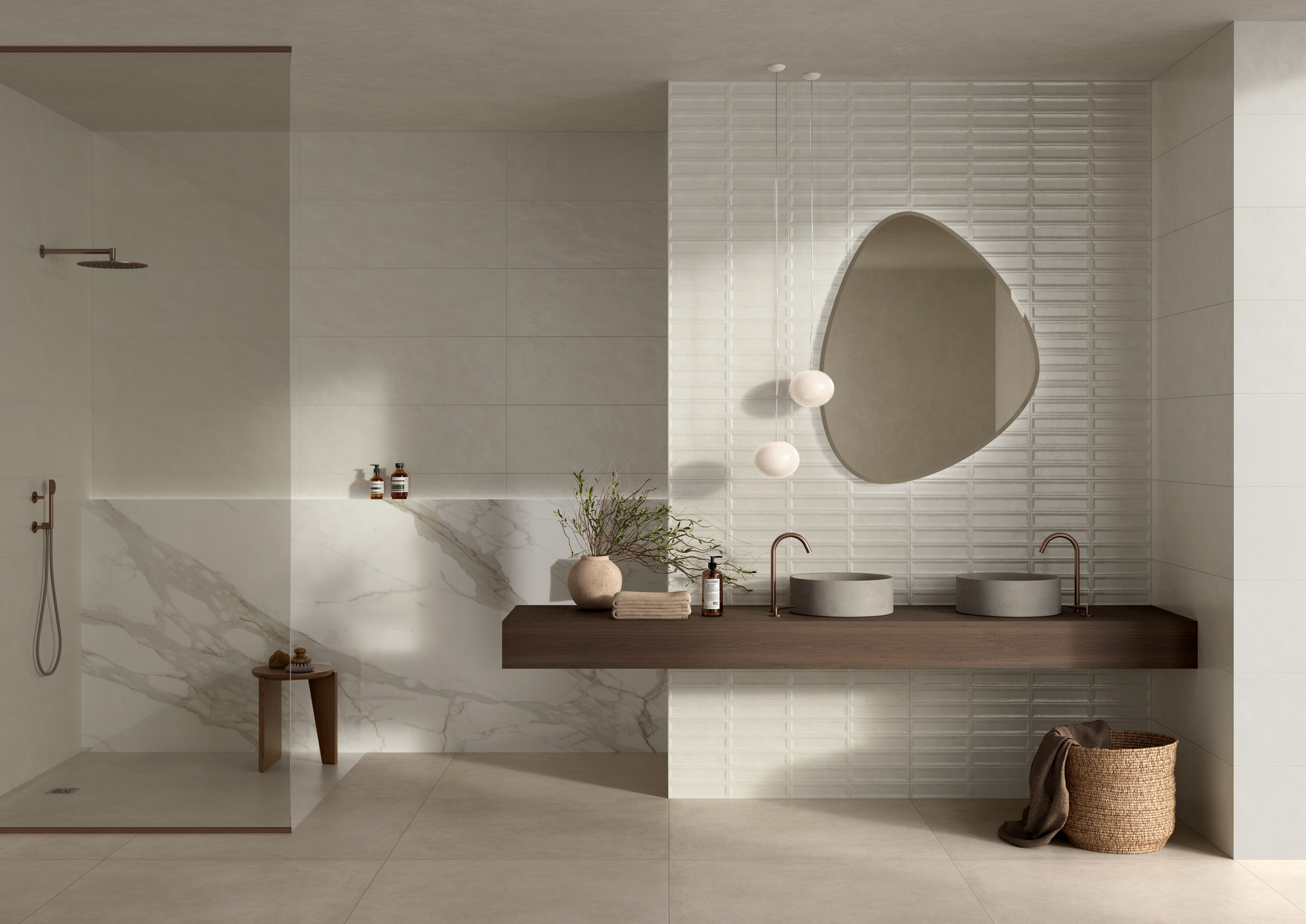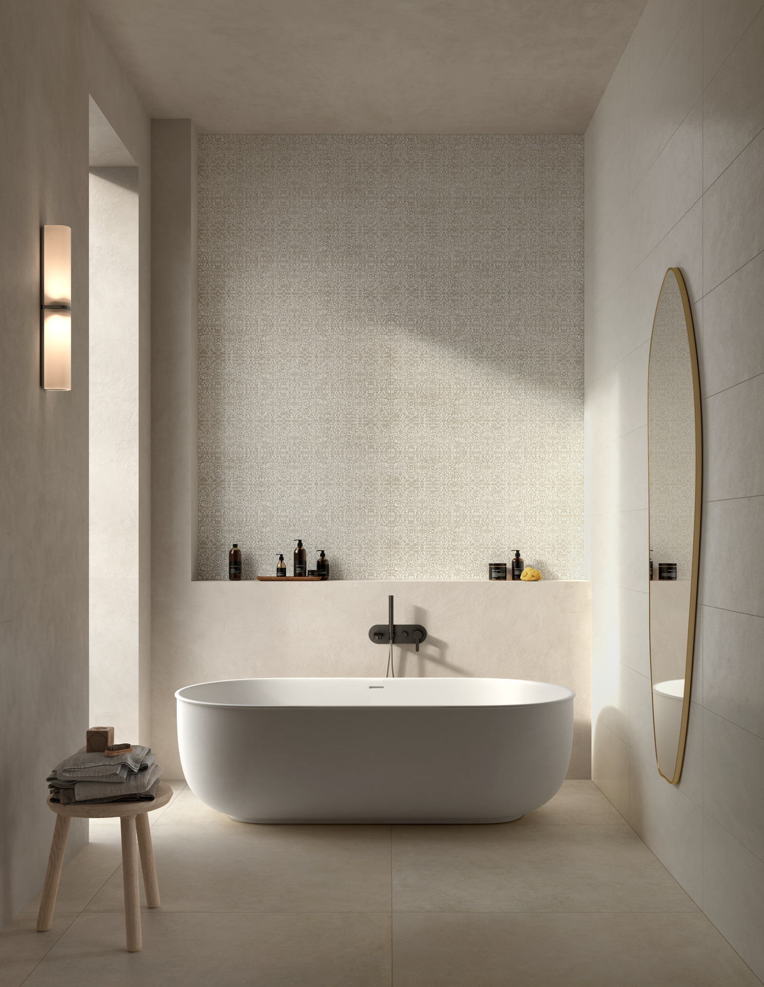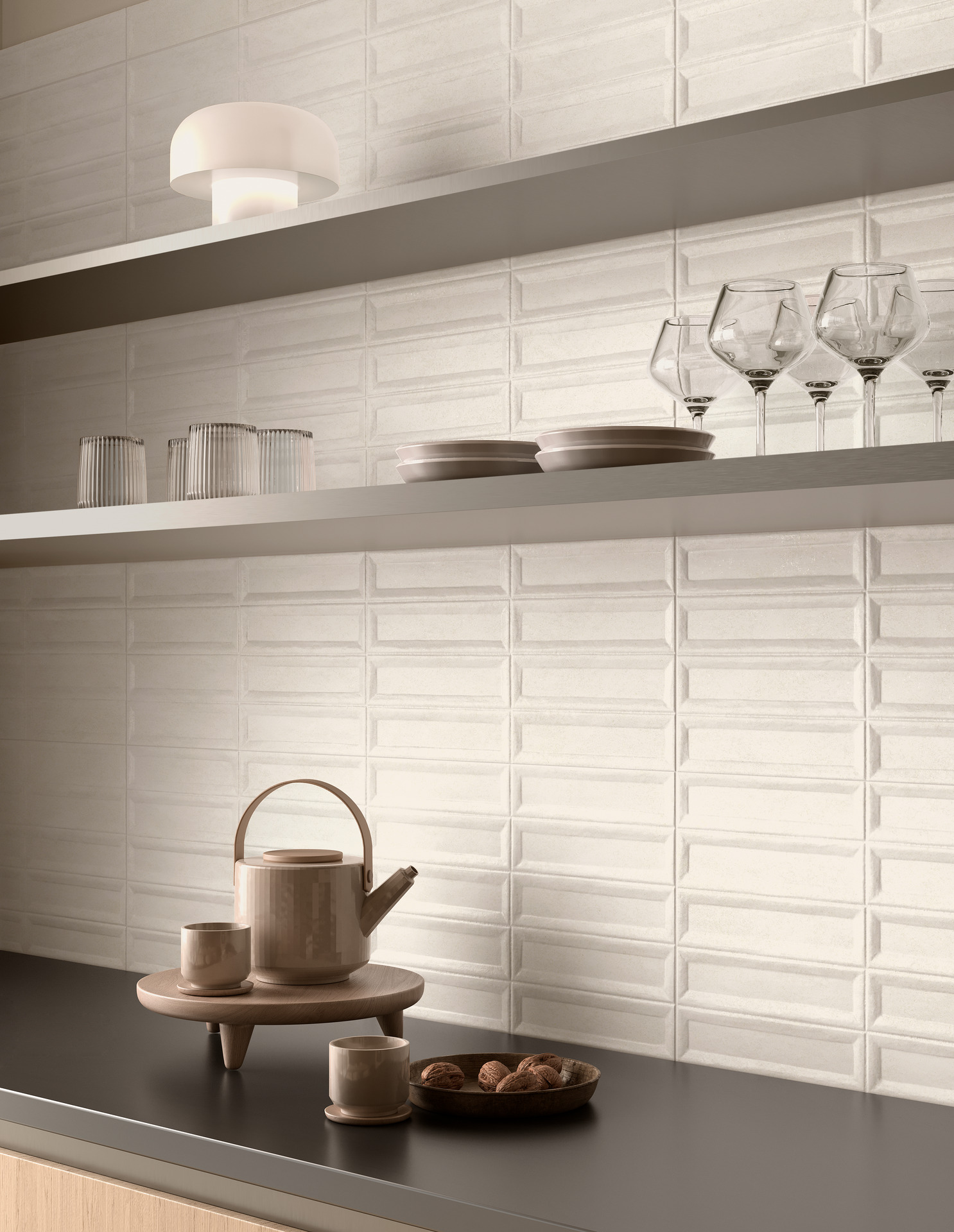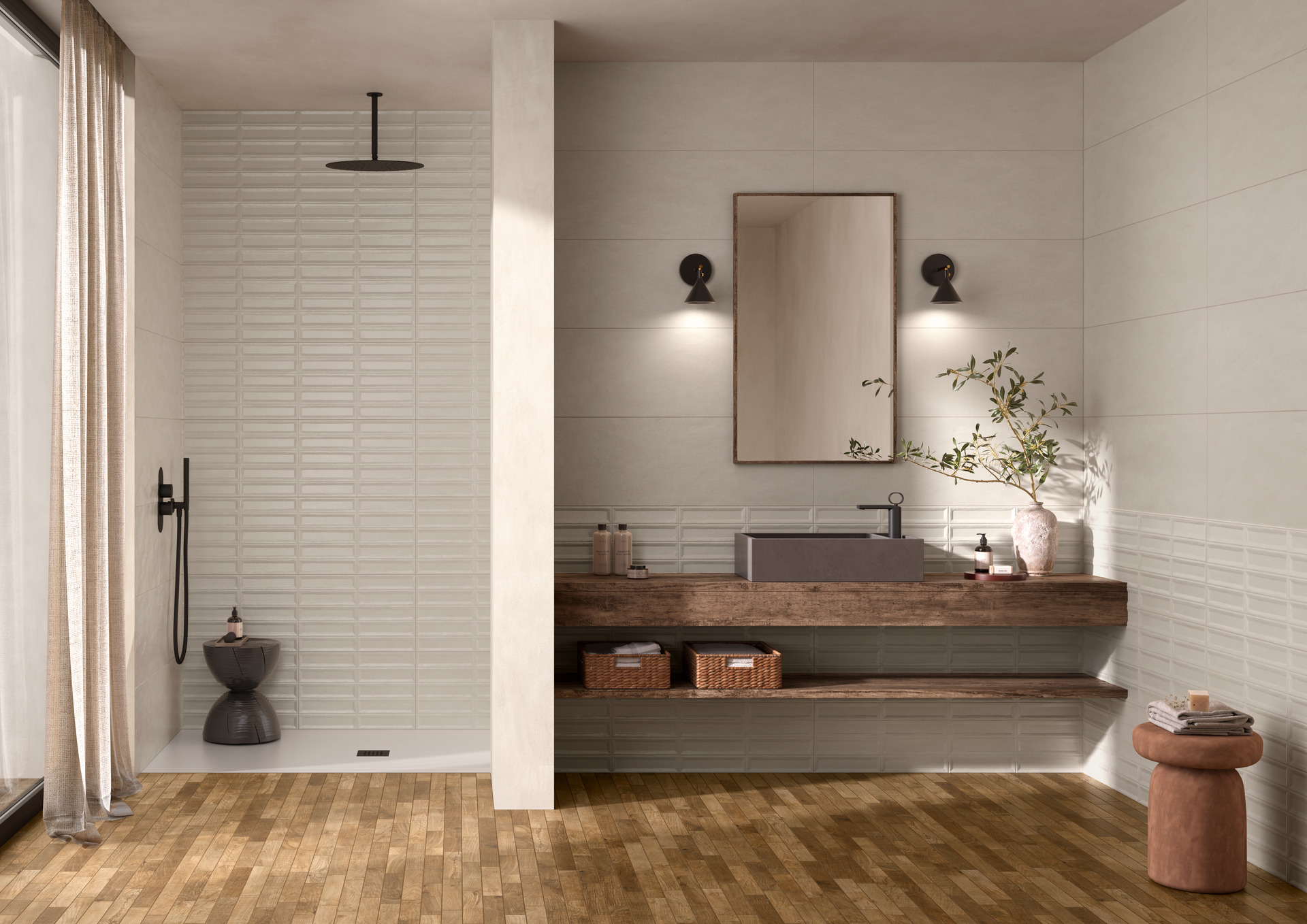 The series is available in a unique 33×100 cm format and in two neutral, versatile shades: Pomice, the lighter one, and Calce, slightly darker. Alongside the two base tiles, there are two three-dimensional structures and one decorative piece that amplify the expressive power of the project.