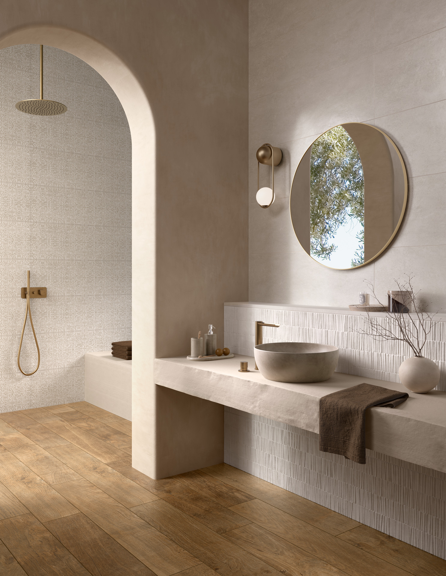 Hand is the collection that celebrates material in its most essential and pure form. A white-body tile that evokes the aesthetic of plastered and hand-worked surfaces. The textures alternate between smooth areas and denser portions, marked by solids and voids, as if sculpted by an artisan’s touch. The graphics are subtle, barely hinted at, while the surface is deeply textured, enhanced by 3D Ink technology, which gives it realism and tactility.