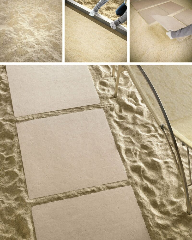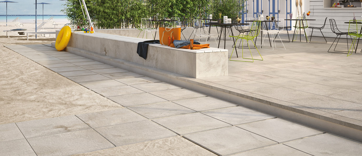 Dry installation on sand. Installation on sand maintains the drainage of the ground, allowing water to flow through the joints between the ceramic slabs. This dry installation solution is ideal where it is not possible to install a permanent paving or where there is a need to frequently change the layout of the paving. An exceptionally durable anti-slip product that is resistant to heavy loads, wear and weathering, XT20 stoneware is ideal for walkways and beach resorts.